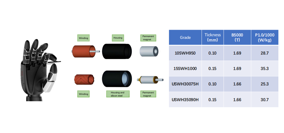 Mains de précision et moteurs sans noyau : Les mains de précision des robots nécessitent des moteurs plus précis, tels que les moteurs sans noyau et les moteurs de couple sans carter. L’acier au silicium ultra-mince répond aux exigences de fabrication des moteurs sans noyau pour mains de précision, d’une épaisseur de seulement 6 millimètres, et constitue la base d’une manipulation fine des doigts.